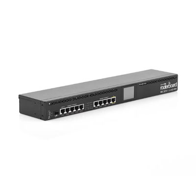 La unidad RB3011UiAS-RM viene con un gabinete de montaje en rack de 1U, un panel LCD de pantalla táctil, un puerto de consola serie y funcionalidad de salida PoE en el último puerto Ethernet.